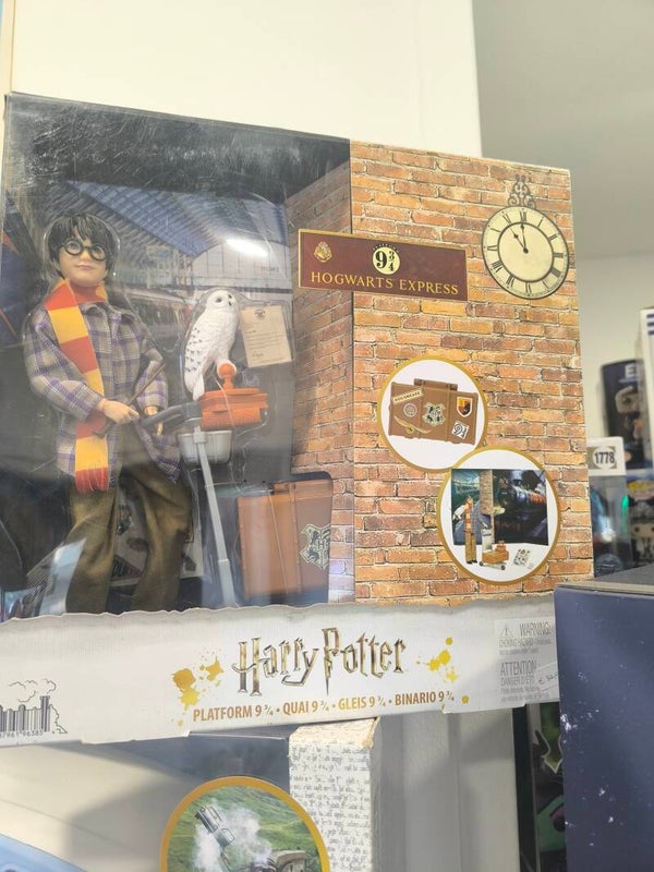 Il set include una dettagliata action figure di Harry Potter, vestito con la sua uniforme di Hogwarts e la sciarpa Grifondoro. Accanto a lui, troviamo una magnifica riproduzione di Edvige appollaiata sul suo bagaglio. La confezione stessa è un omaggio alla magica piattaforma, con un design che richiama il muro di mattoni e il famoso cartello "Platform 9 3/4".