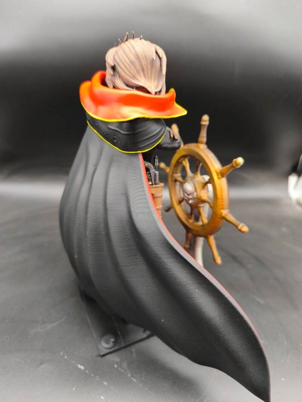 Il timone della sua nave, con il suo design intricato e il teschio al centro, è un elemento centrale della statuetta, simbolo del suo spirito indomito e del suo viaggio attraverso le stelle. La base completa l'opera, richiamando l'ambiente spaziale.