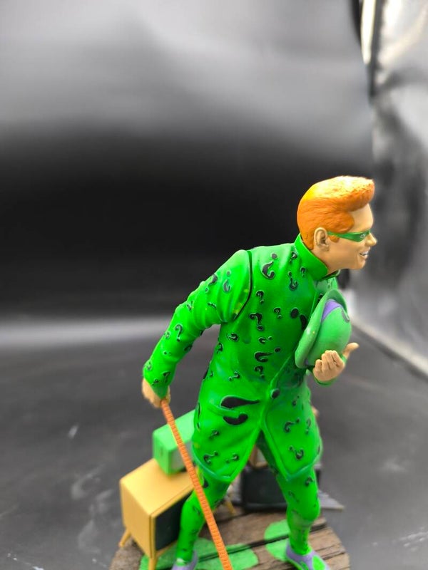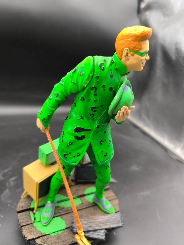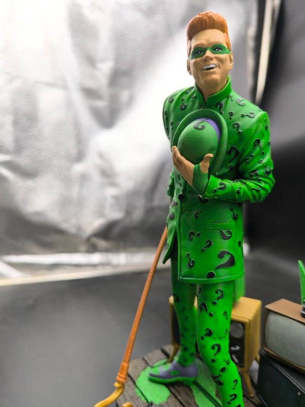 Ammira il suo completo verde sgargiante, interamente decorato con minacciosi punti interrogativi neri, reso con una pittura a mano che ne esalta ogni dettaglio e piega. Il suo sorriso beffardo, celato dietro gli occhiali verdi, e la posa dinamica con il suo inseparabile bastone a forma di punto interrogativo e la bombetta verde in mano, trasudano la sua ossessione per gli enigmi e il suo desiderio di superare il Cavaliere Oscuro, con un'espressività che ricorda la performance di Jim Carrey.